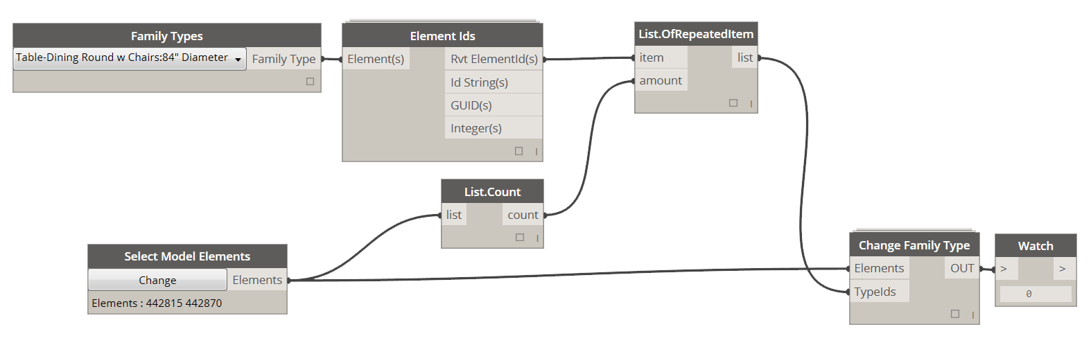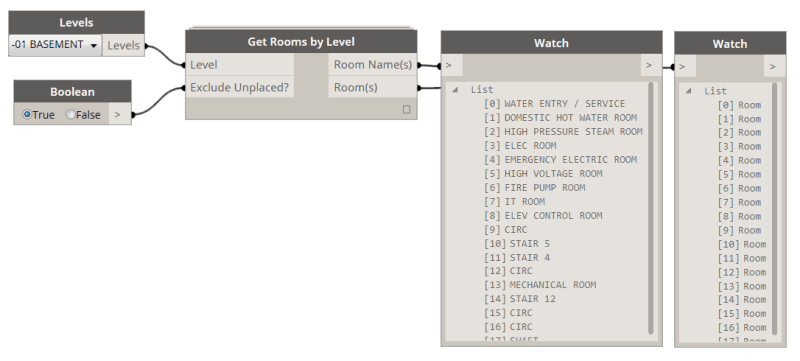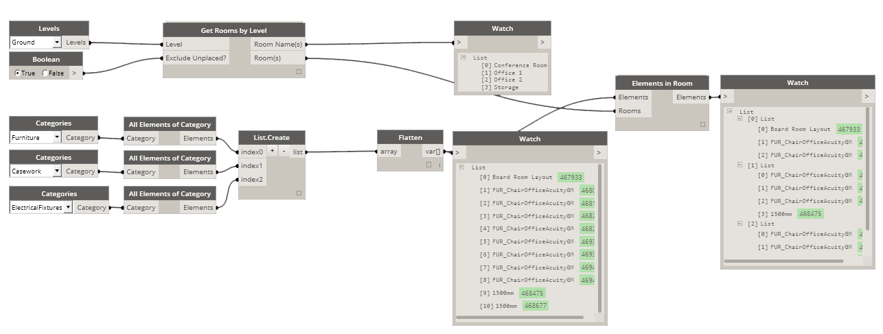 This node will check all of the supplied elements if they are located in any of the supplied rooms. The output will be a list of families grouped into sublists that match the order of supplied rooms, which makes for easy grouping of all families within a room. Use multiple All Elements of Category nodes to combine specified category types of elements. Use Get Rooms by Level to get all rooms per level that are placed.