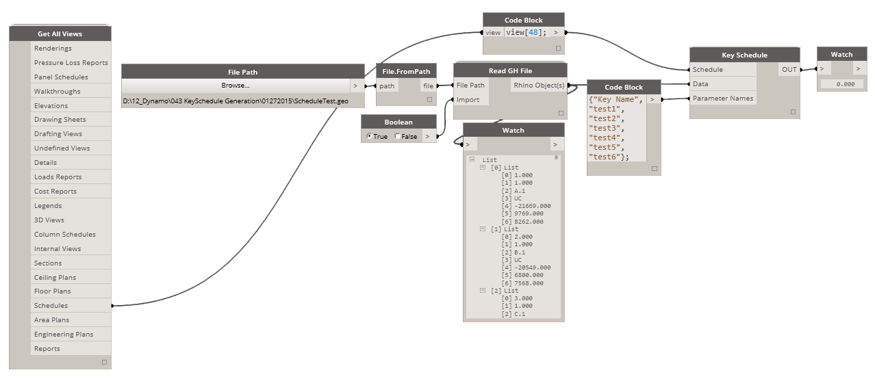 Now this node WILL NOT CREATE a Key Schedule. This node will take a key schedule created in Revit and add rows based on number of data points in the Data input. It will then take the data supplied and fill in the parameters for each row. If you know how KeySchedules operate under the hood in Revit then you know that each row of in a key schedule is an element in Revit DB (like a family). Each element then has as many parameters assigned to it as there is parameters (columns) in the schedule. Each key schedule comes standard with a Key Name parameter already loaded and added to every new row. that’s the first data point in all of my sublists. Each sublist holds as many items as there are total parameters (columns). Keep that formatting going and you will be fine.