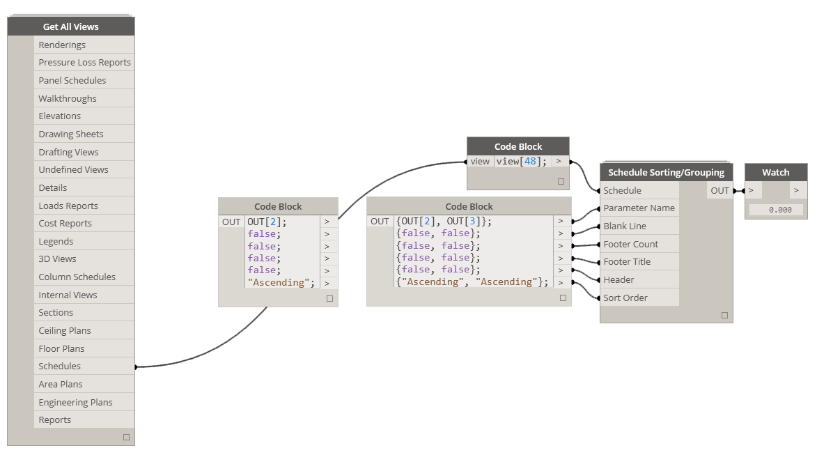 This node controls schedule grouping. Just like in the regular Revit UI, you can only set 3 sorting and grouping parameters (Revit 2014). Please see the example below for setting one sorting parameter (smaller Code Block) and multiple parameters (larger Code Block)I believe that in Revit 2015 you can use more, but I haven’t tested this on 2015 yet. I don’t know why, I am still in 2014 which makes no sense since Autodesk is on subscription so everyone has updated to newer version of Revit. I think its time to move on. Inputs are: