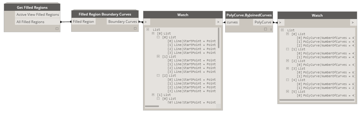 This node will query all of the boundary curves from a give filled region. Each loop of curves then will be outputted as a sub-list for that filled region. This makes it easy then to join all of the curves into polycurves while maintaining the association with the original source.