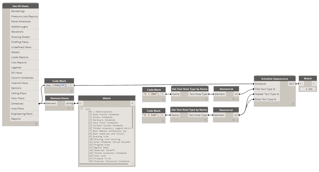 Use this node to retrieve a Text Type by its name. Remember that with imperial naming, where quotation marks are used to indicate inches, you need to use backslash followed by quotation mark to not break the string (code block only). You can also use regular Dynamo String node and not worry about what I just said.