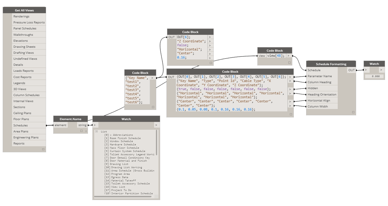 This node will allow you to control schedule formatting. Just like in the Revit UI you can control some basic visibility settings per parameter (column) in a schedule. Parameter inputs are: